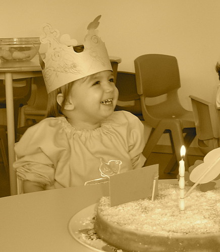 Quando chegámos a Teresa nem queria acreditar. Até porque os avós maternos estavam de passagem por Coimbra e foram lá dar uma beijoca à princesa. A família a entrar no infantário!! Cantámos os parabéns, demos uma prendinha a cada um dos meninos, e viemos para casa brincar com a boneca Laura (um Nenuco que foi a nossa prenda). À noite comemos massa com xixa e para a loucura ser total, um bolinho de amêndoa que os avós trouxeram de terras algarvias.