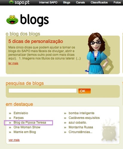 (Obrigada Sapo pela distinção. É estranho este cantinho que sempre foi visitado mais ou menos pelas mesmas 20 pessoas ter recebido, até ao momento, quase 400 visitas.)