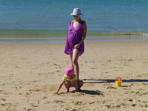 Agora a gravidez. :) Estamos a chegar à reta final. Durante as férias correu tudo bem. Andei sempre bem disposta e com energia. Lá andei na praia a passear o barrigão. hehe. Em Julho já estava a começar a ter algumas queixas: umas dores no fundo da barriga, muitas dores nas virilhas, algum cansaço. Mas depois vieram as férias e tudo melhorou. :)